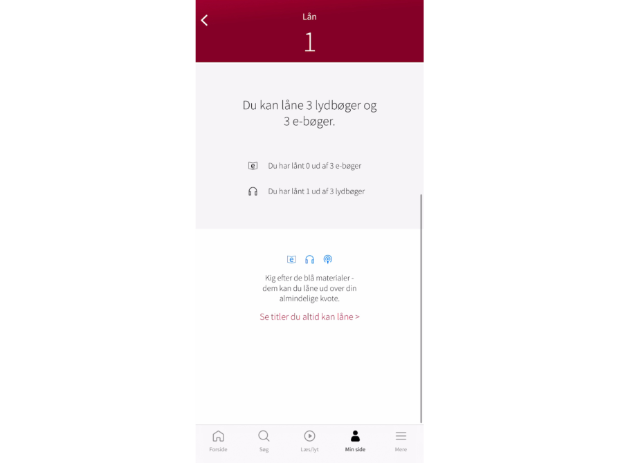 Du kan altid se, hvor mange bøger man kan låne i din kommune, ved at klikke på "Min side" i bundmenuen i eReolens app og herefter trykke på "Lån". Her vil det fremgå, hvor mange hhv. ebøger og lydbøger du kan låne, og hvor mange du allerede har lånt.